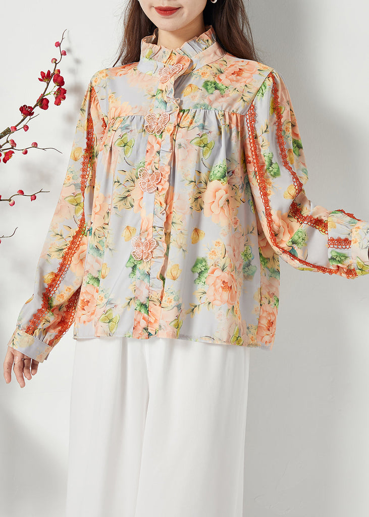 Plus Size Orange Ruffled Print Chiffon Shirt Top Spring