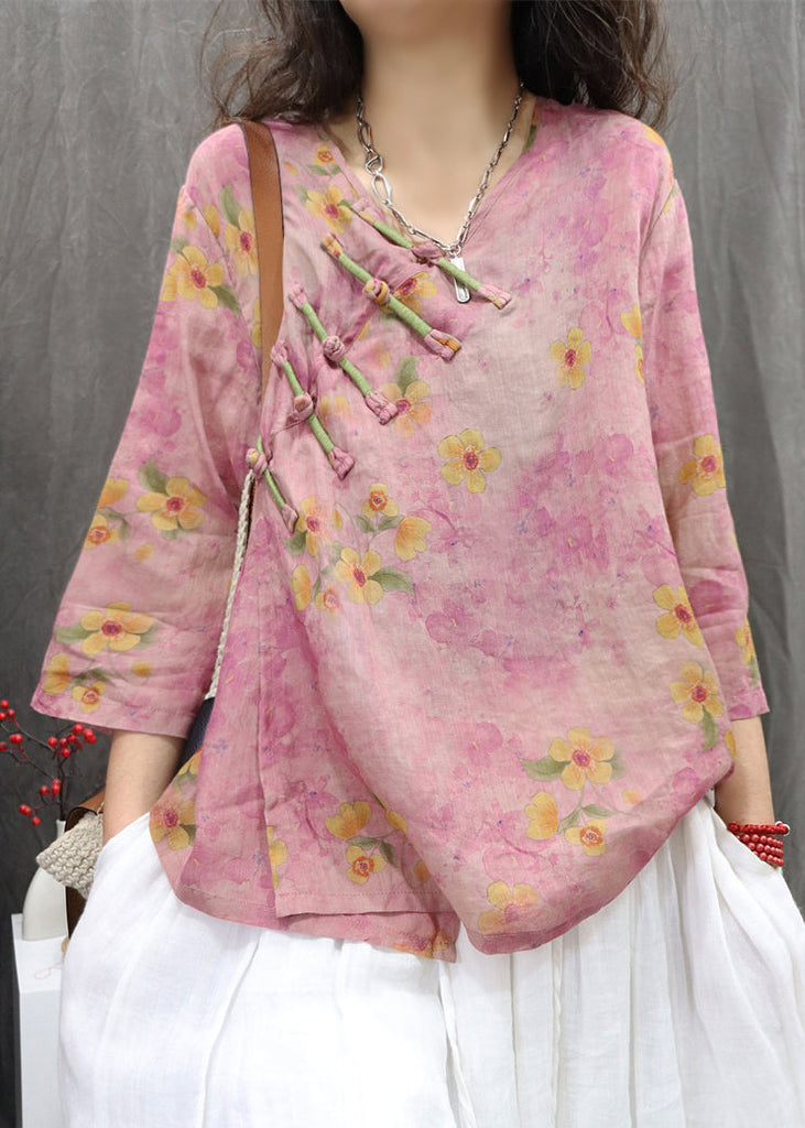 Vintage Purple V Neck Chinese Button Linen Shirt Spring