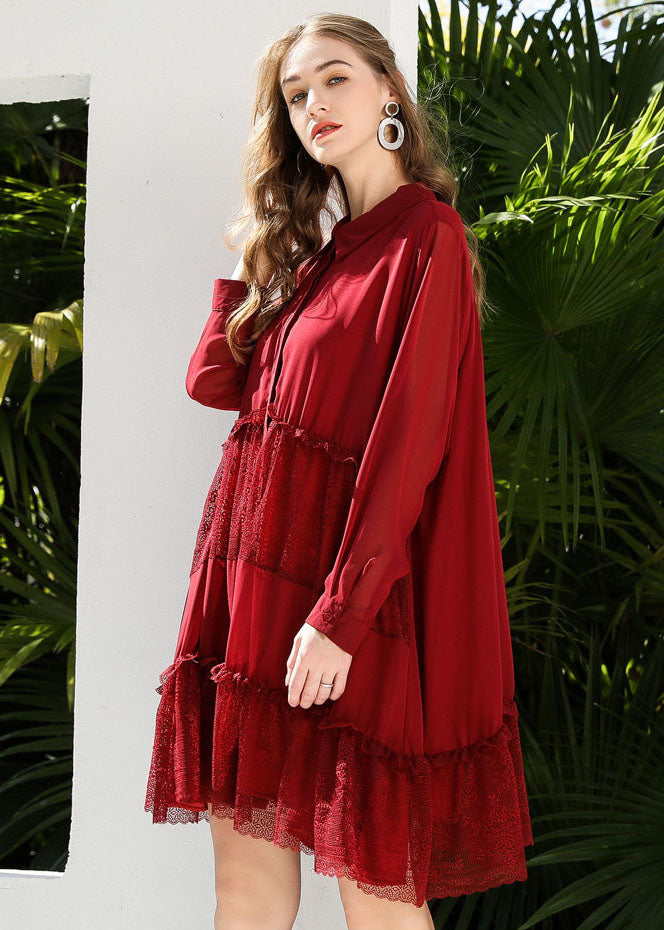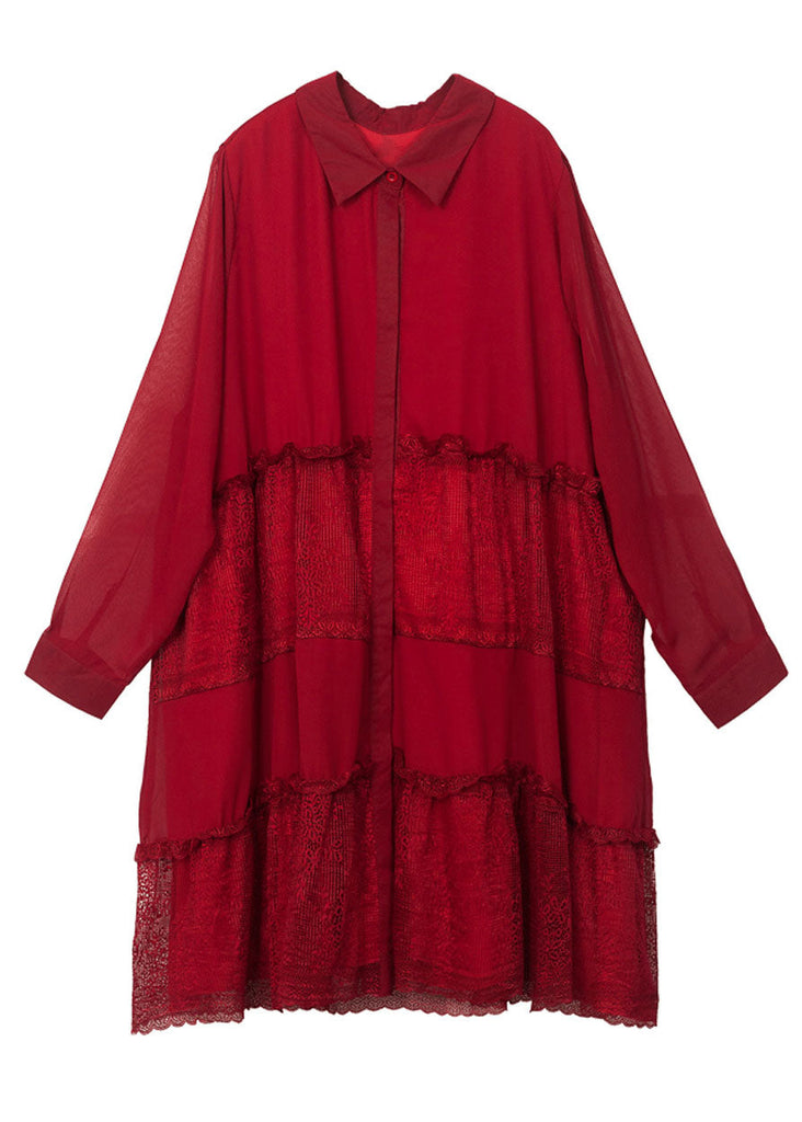 Red Patchwork Lace Chiffon Shirt Dress Ruffled Exra Large Hem Spring