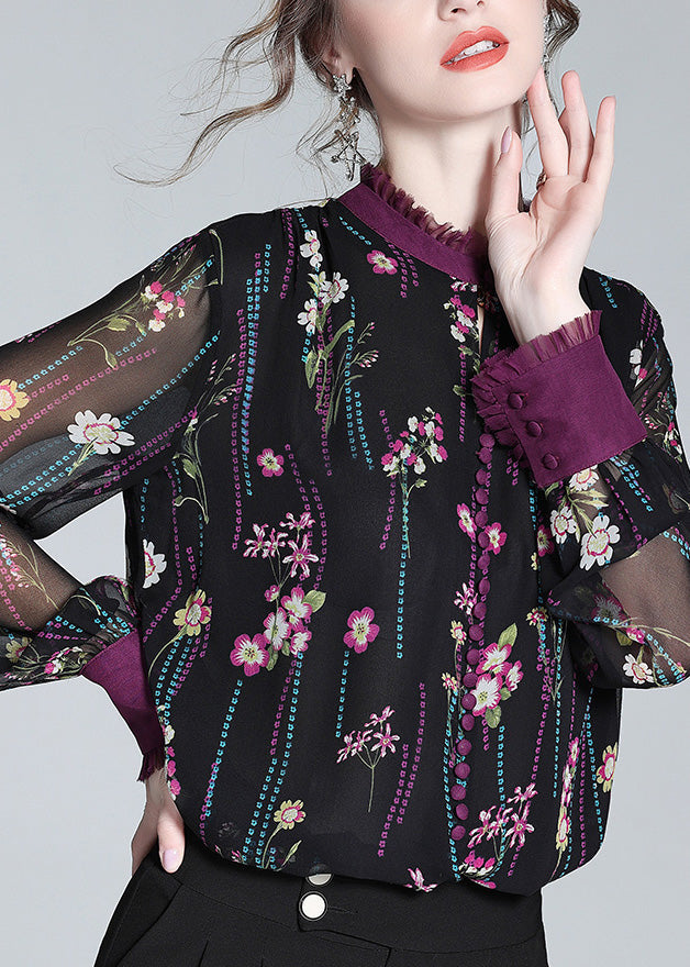 The Retro Black Ruffled Graphic Print Hollow Out Button Silk Shirt Spring LY0726 is a sensational customer favorite, and we hope you like it just as much.