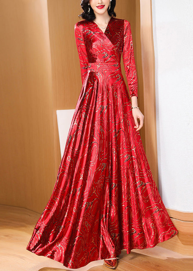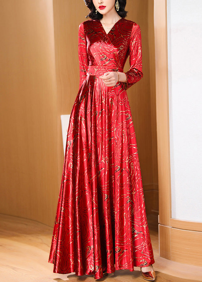 Retro Red Print Slim Fit Satin Long Dresses Spring