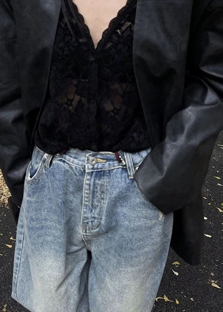 Shirt Spring Neck Bohemian Black Lace Hollow Out V