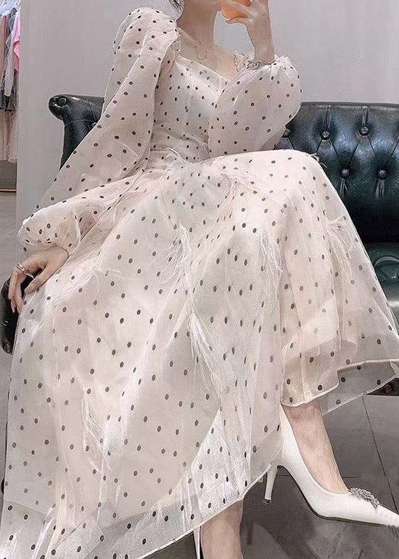 Slim Fit Beige Square Collar Dot Tulle Long Dresses Spring