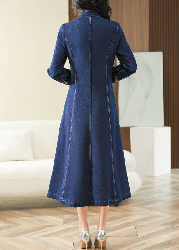 Slim Fit Blue Embroideried Chinese Button Exra Large Hem Denim Dress Spring