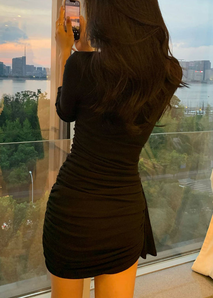 Spring Nail Bead Dress V Neck Fit Slim Cotton Mid Black FashionChic