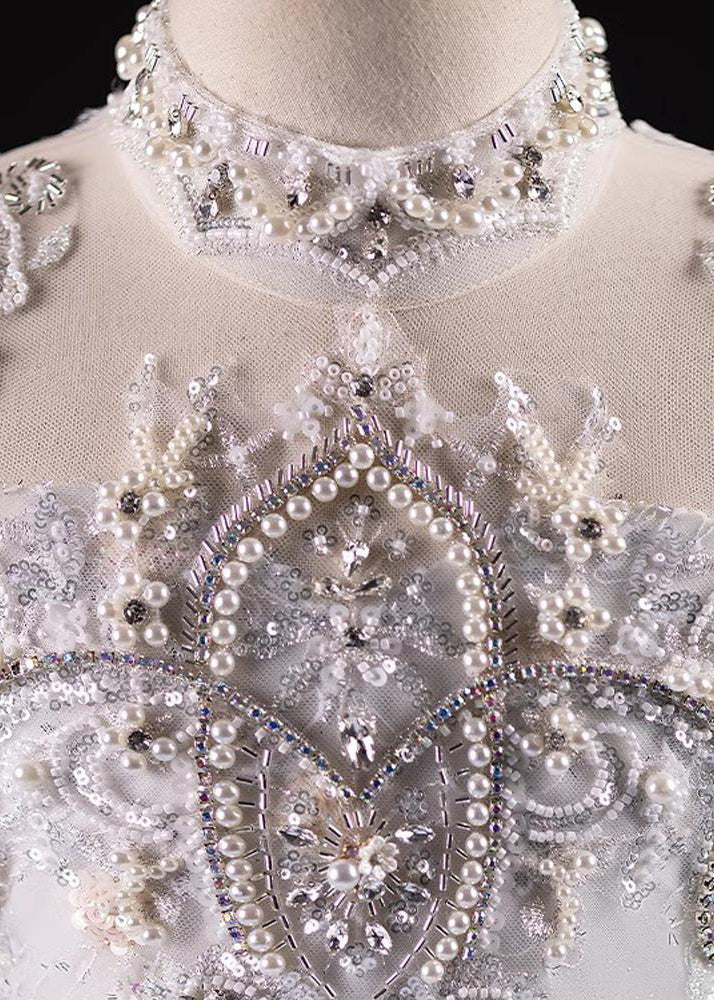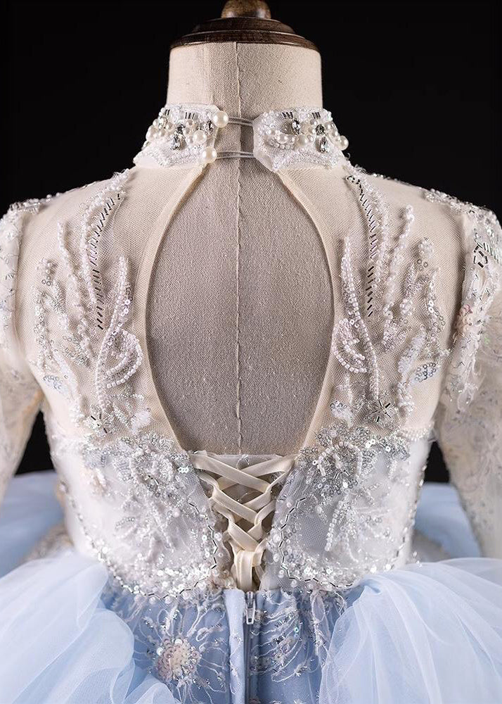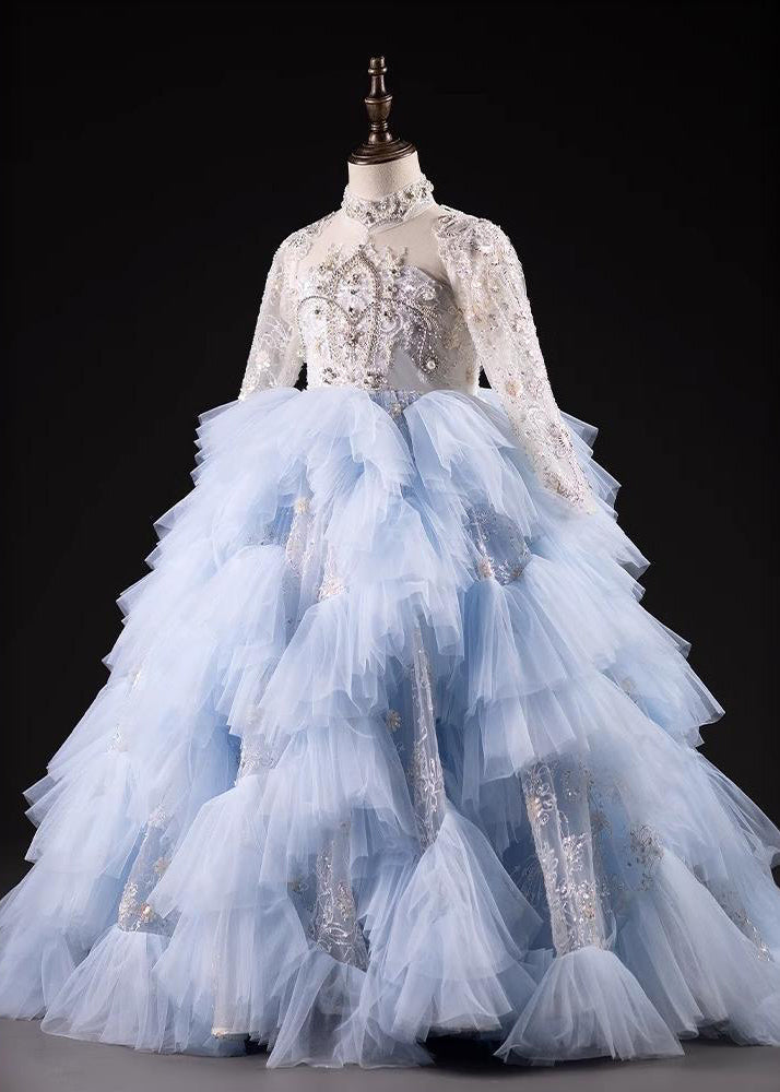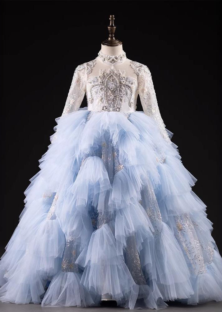 Boutique Light Blue Nail Bead Tulle Kids Maxi Dresses Spring