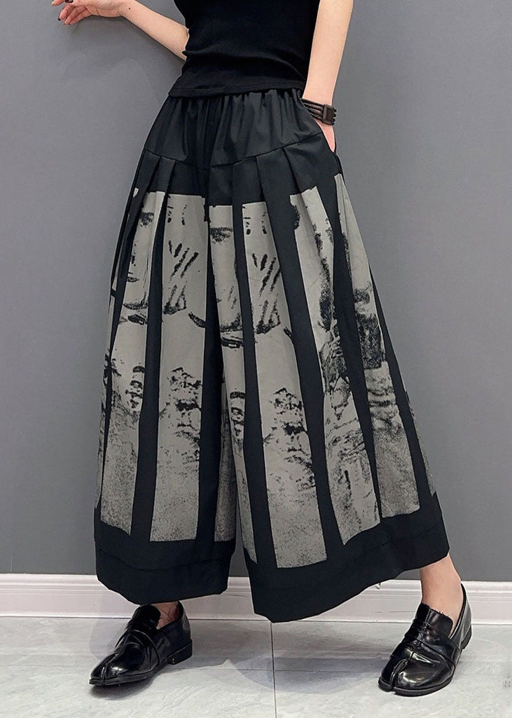 Style Black Elastic Waist Pockets Print Cotton Wide Leg Pants Spring