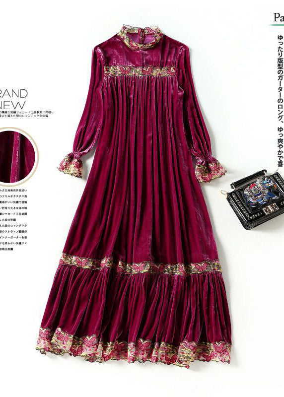 Style Purple Stand Collar Patchwork Embroideried Silk blended Velour Robe Dresses Spring