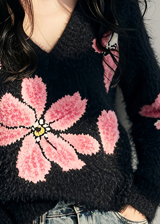 Stylish Black V Neck Floral Ma Hai Mao Knit Sweater Spring TN034