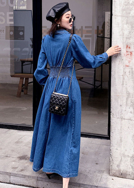 Stylish Denim Blue Cinched Patchwork Elastic Waist Long Dresses Spring AC2033