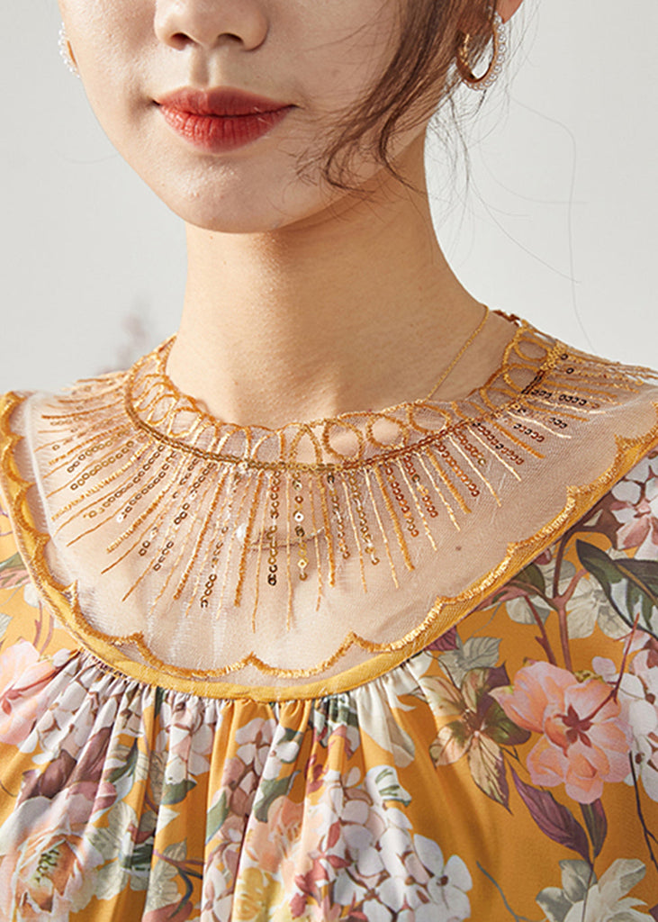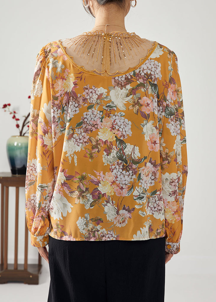 Stylish Khaki Sequins Tulle Patchwork Print Chiffon Shirt Top Spring