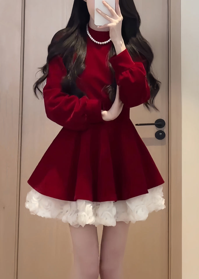 Simple Black O Neck Solid Patchwork Silk Velvet Mid Dress Spring