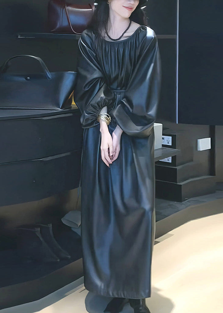 Vintage Black Cinched Tie Waist Solid PU Maxi Dresses Spring RP022