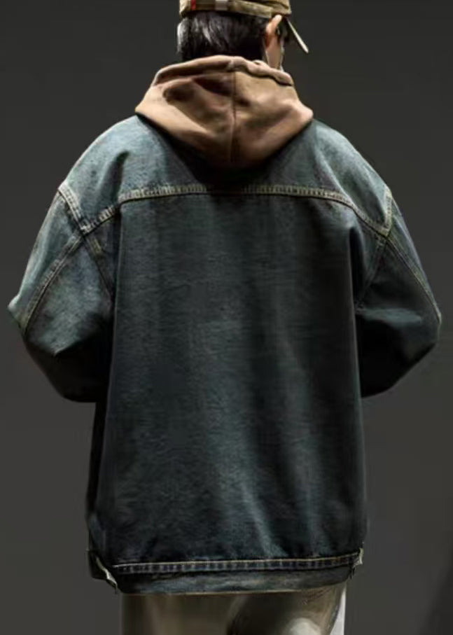 Experience the timeless allure of our Vintage Denim Blue Peter Pan Collar Button Pockets Mens Coats this Spring.