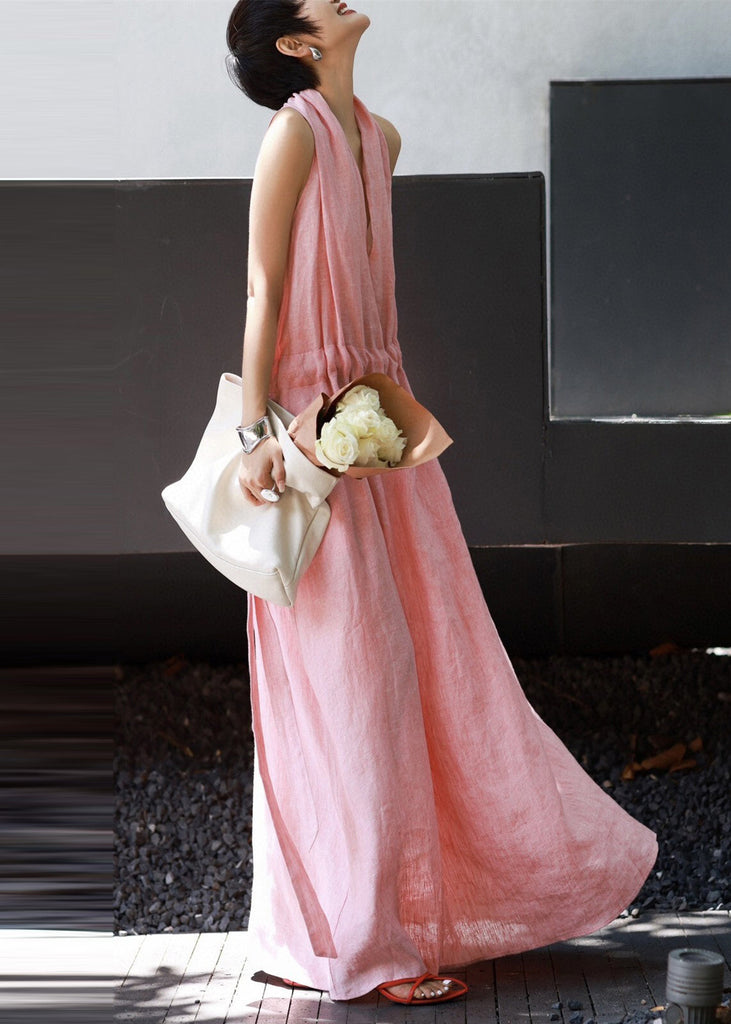 Women Pink Cold Shoulder Drawstring Linen Halter Dresses Summer YY014