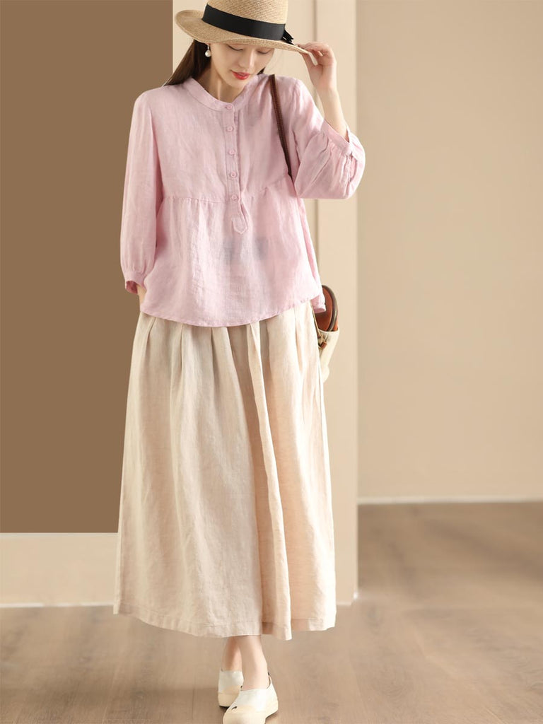 Women Retro Solid Spring Pullover Linen Shirt KL1030