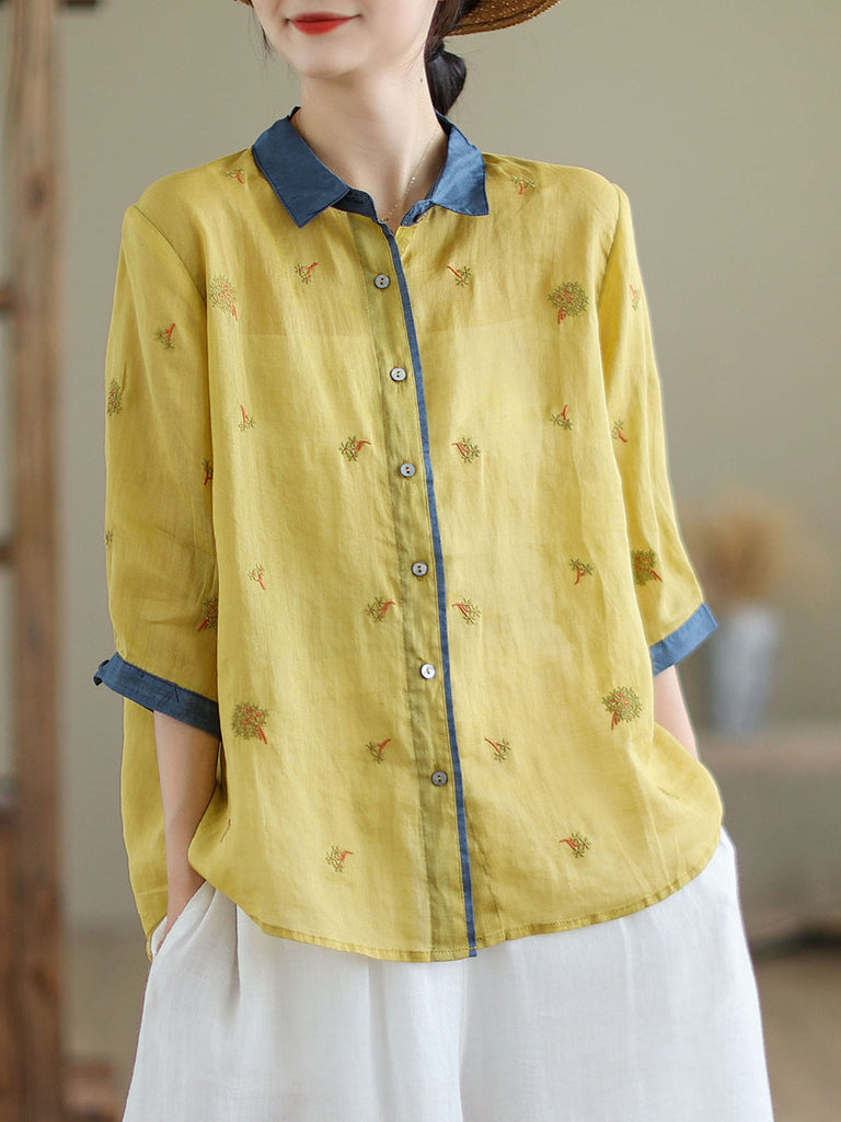 Women Spring Artsy Embroidery Colorblock Ramie Shirt XX1044