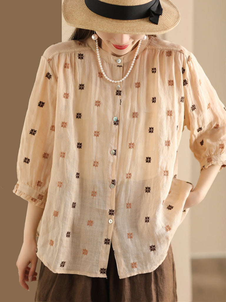 Women Spring Floral Embroidery Linen Button-Up Shirt CO1010