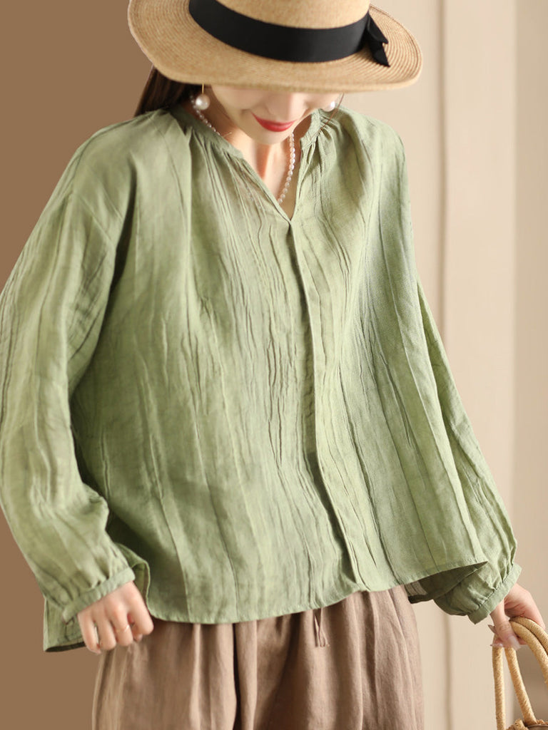 This stylish V-neck blouse is crafted from premium ramie that provides both comfort and durability. The solid pattern is perfect for a versatile and timeless look. The full raglan sleeves add an artistic touch, making it a perfect choice for spring and summer seasons.