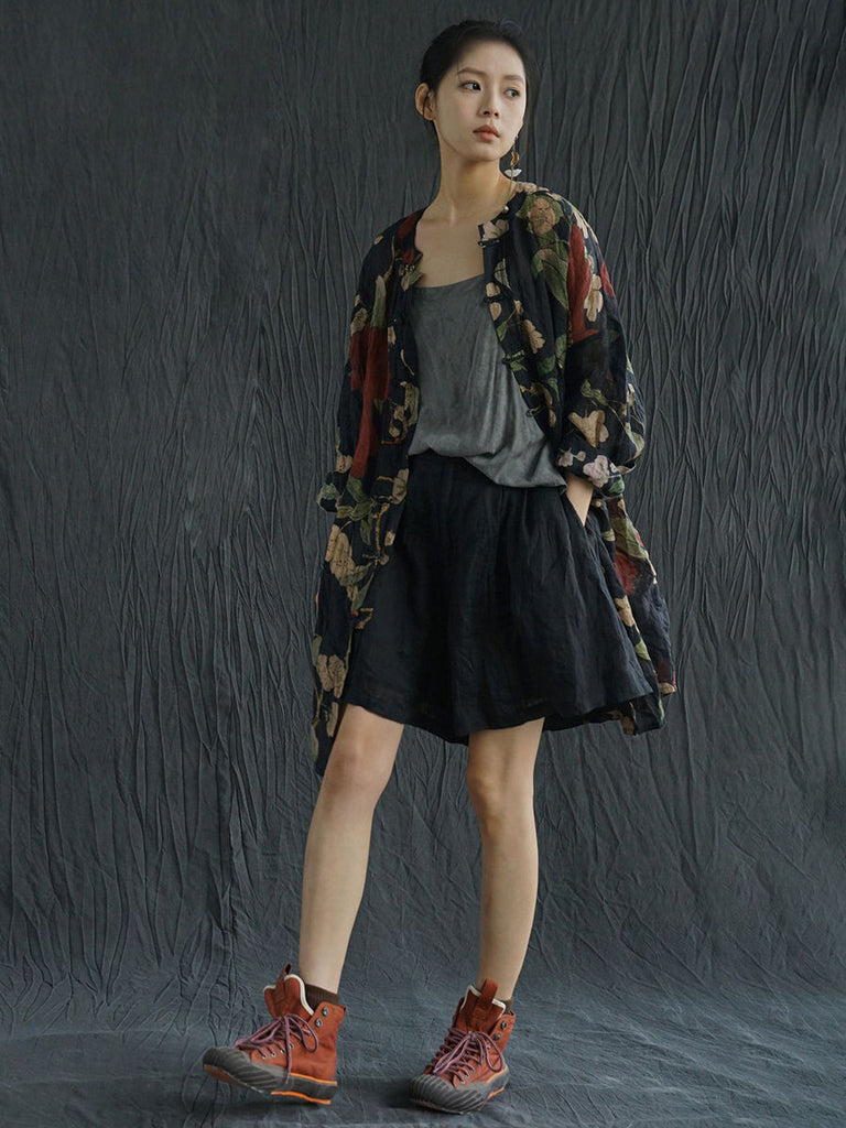 PLus Size Women Vintage Flower Print Ramie Spring Long Shirt AS1032