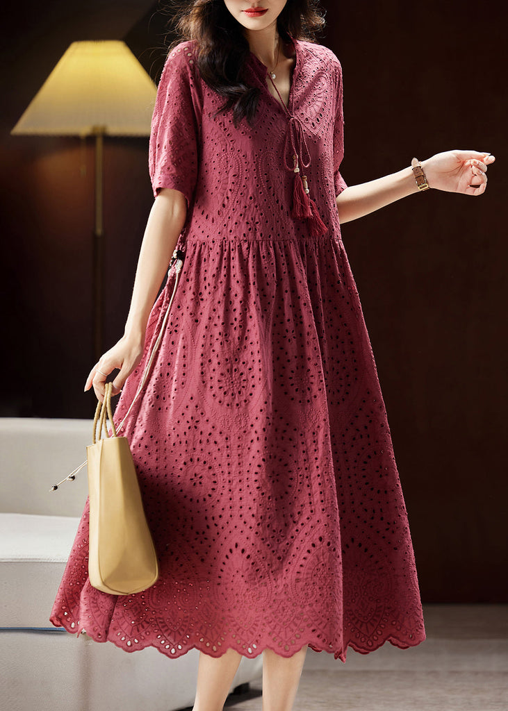 Chic Mulberry V Neck Hollow Out Sashes Cotton Maxi Dress Short Sleeve WW027