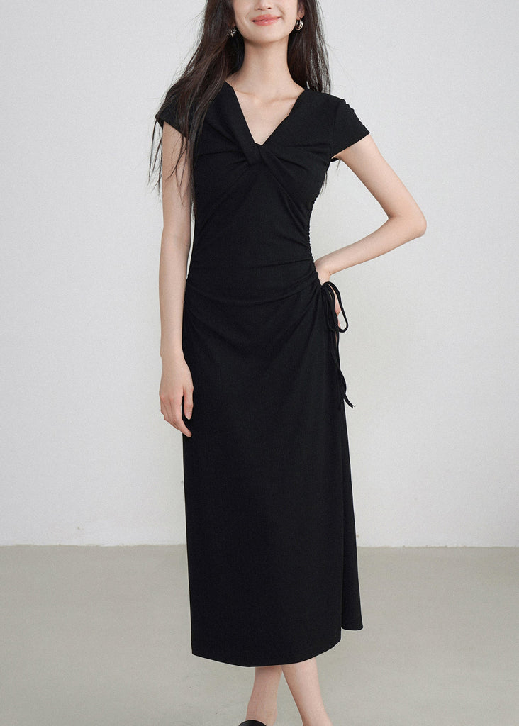 Classy Black V Neck Cinched Maxi Dresses Short Sleeve EE033