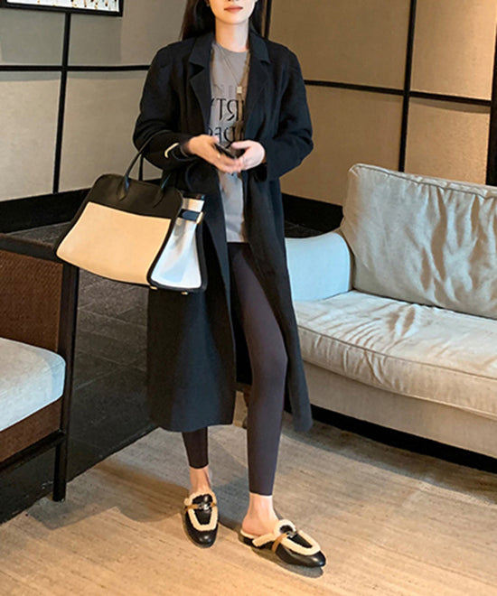 Black Cowhide Leather Slippers Shoes Splicing Fuzzy Wool Lined TP010