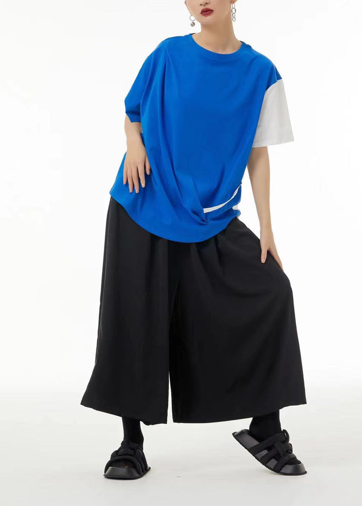Chic Blue O-Neck Patchwork Wrinkled Cotton Tank Tops Summer