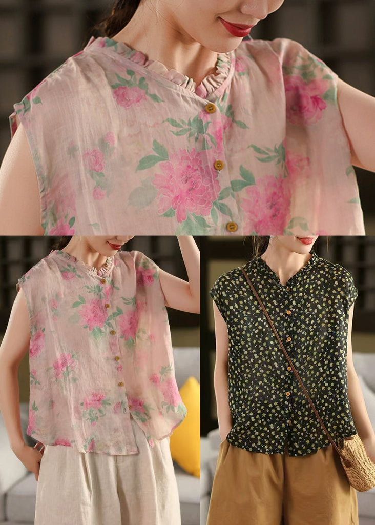 Sleeveless Ruffled Linen Print DIY Tops Pink
