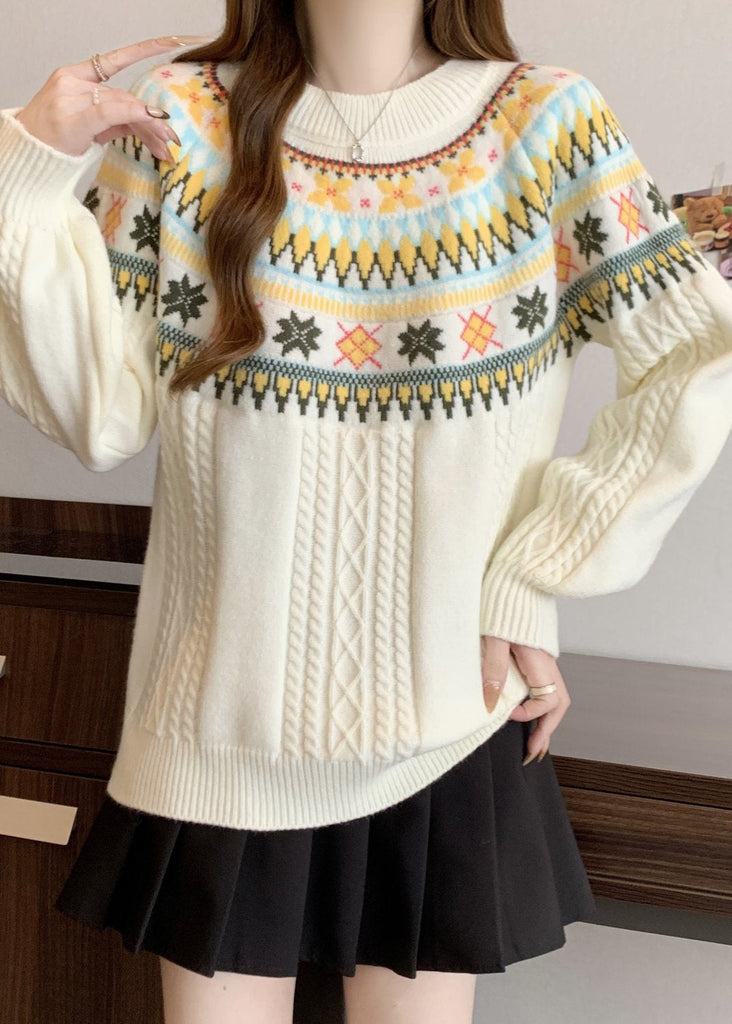 Bohemian Beige O Neck Jacquard Thick Knit Pullover Winter RG029