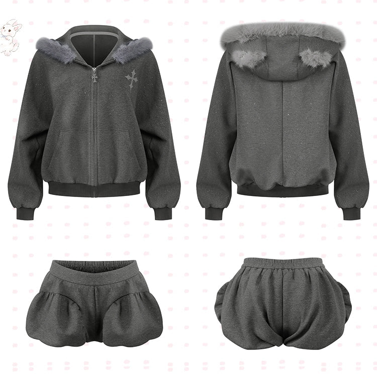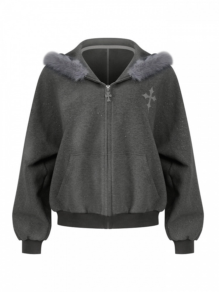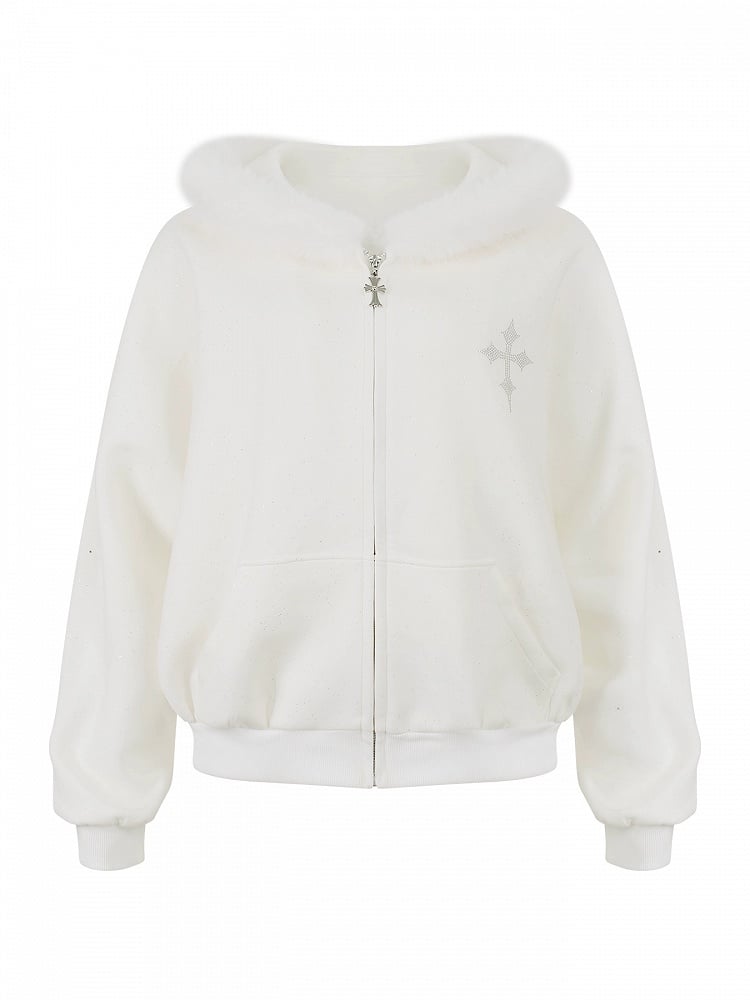 Daily Kawaii White/Gray Bear Ear Hoodie Coat - Lush Fur Hood Trim, Rhinestone Cross & Full Zip Front