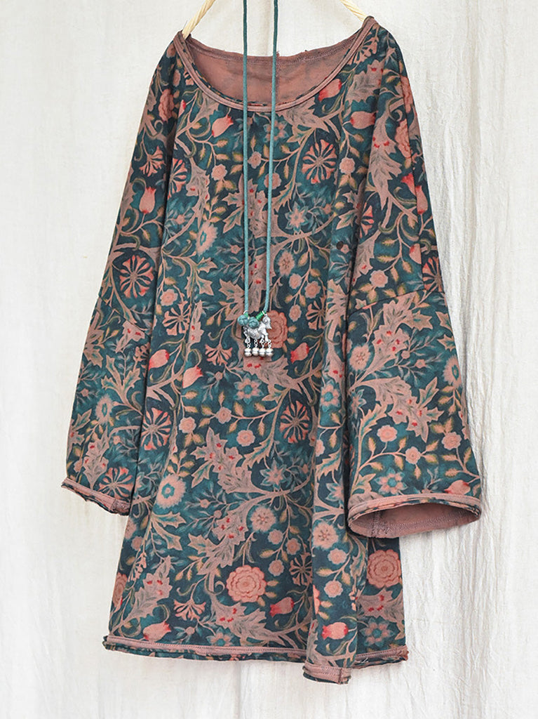 Women Vintage Autumn Flower O-Neck Loose Cotton Shirt AI1006
