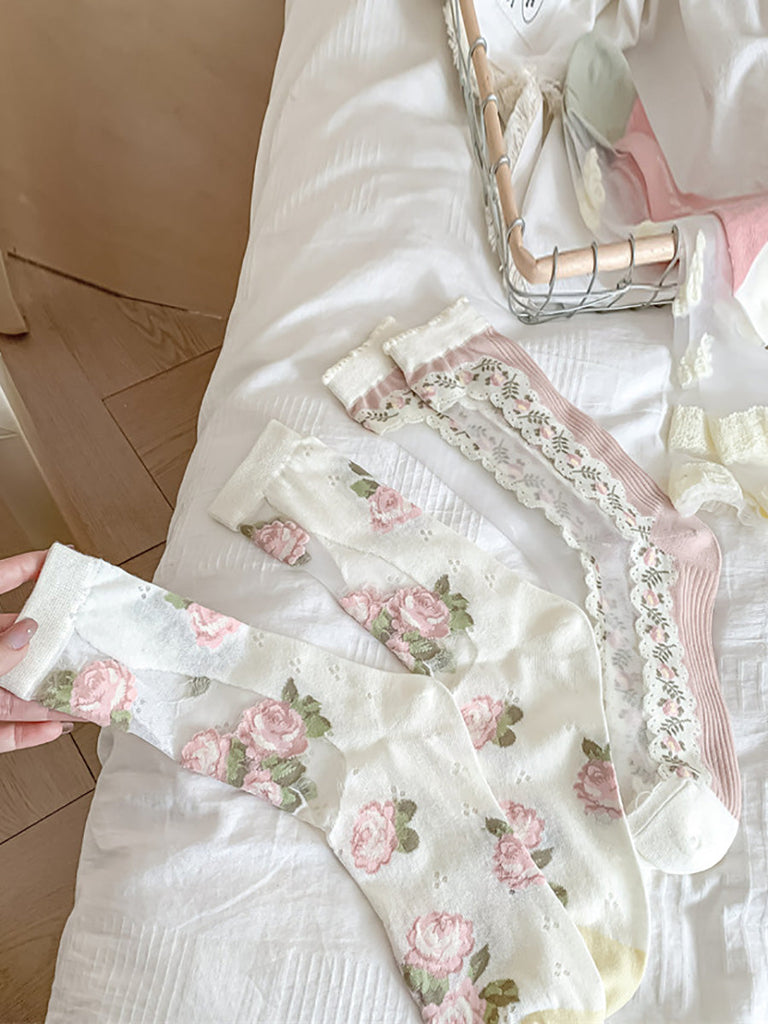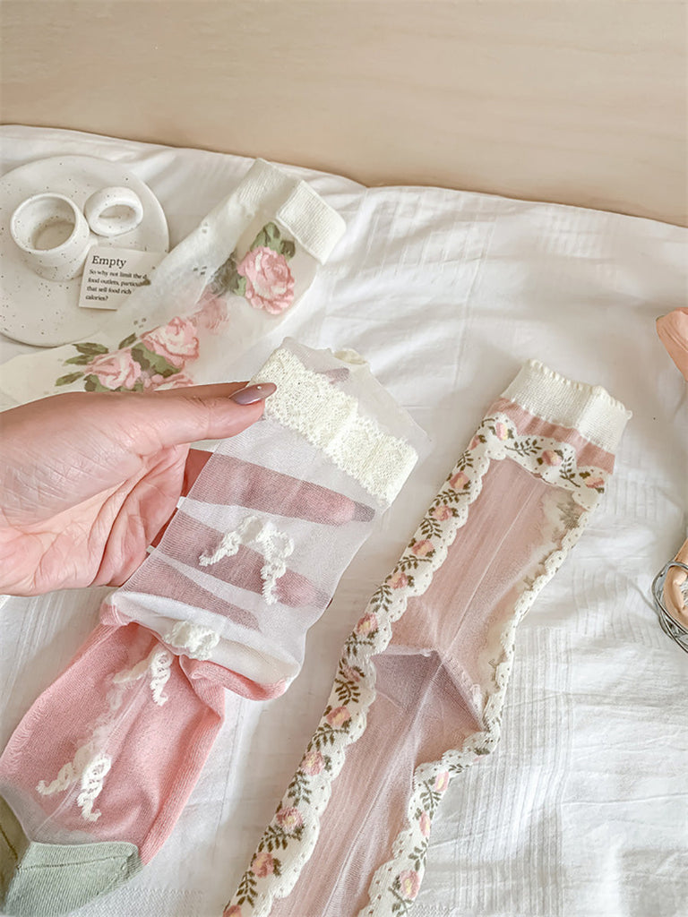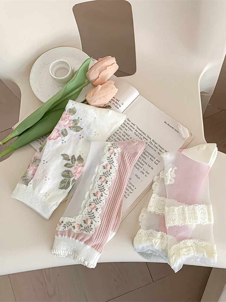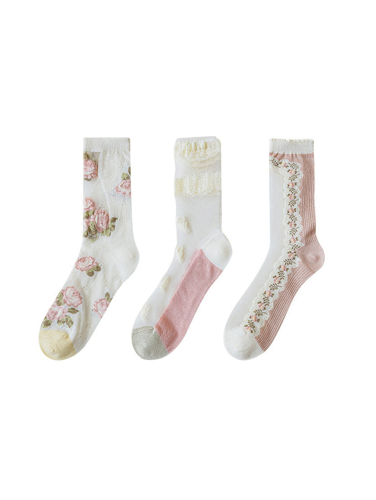 3 Pairs Women Artsy Thin Flower Lace Socks FD034