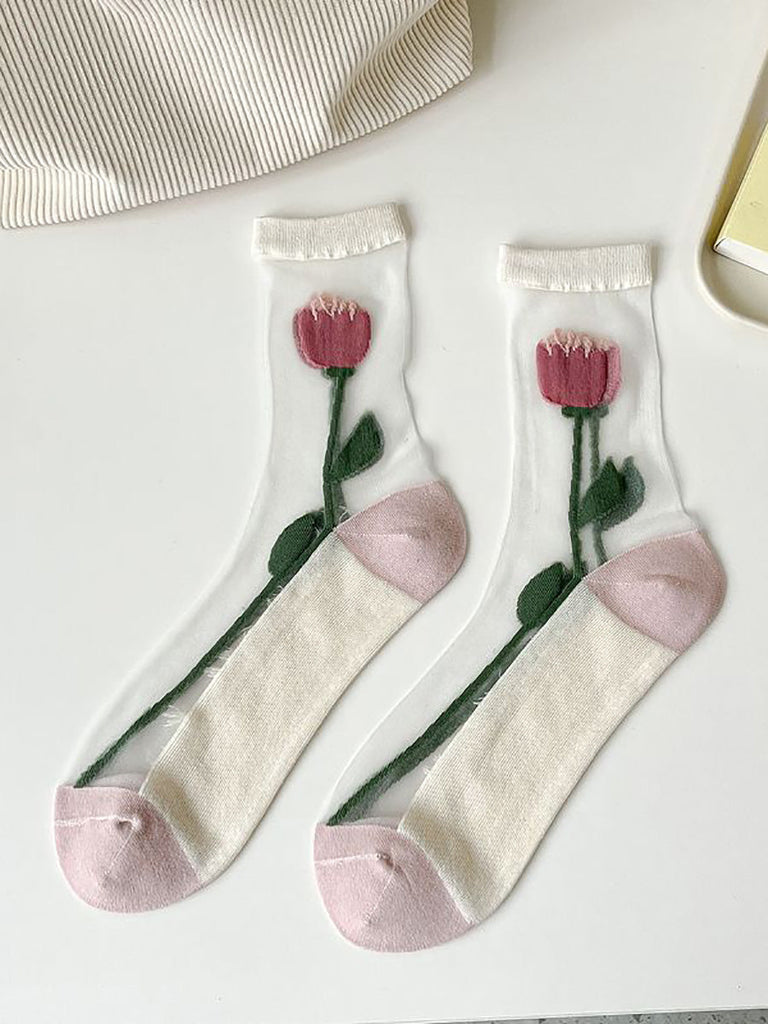 5 Pairs Women Artsy Summer Flower Jacquard Thin Socks CX040