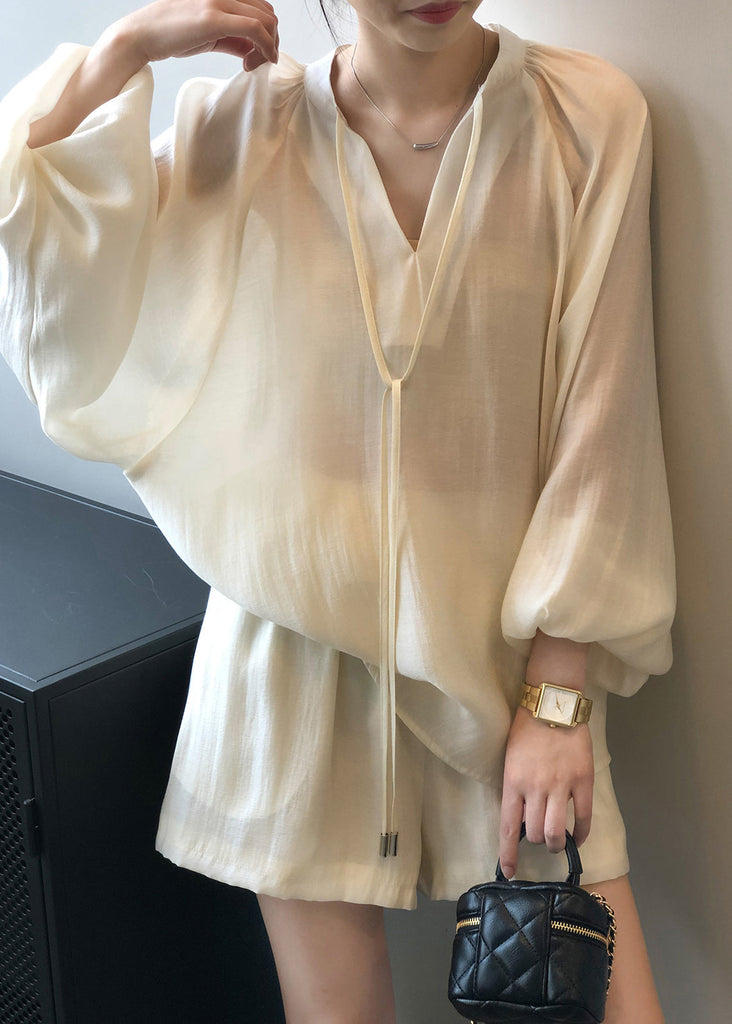 Apricot Solid Elastic Waist Cotton Two Pieces Set Lace Up Summer ZL077