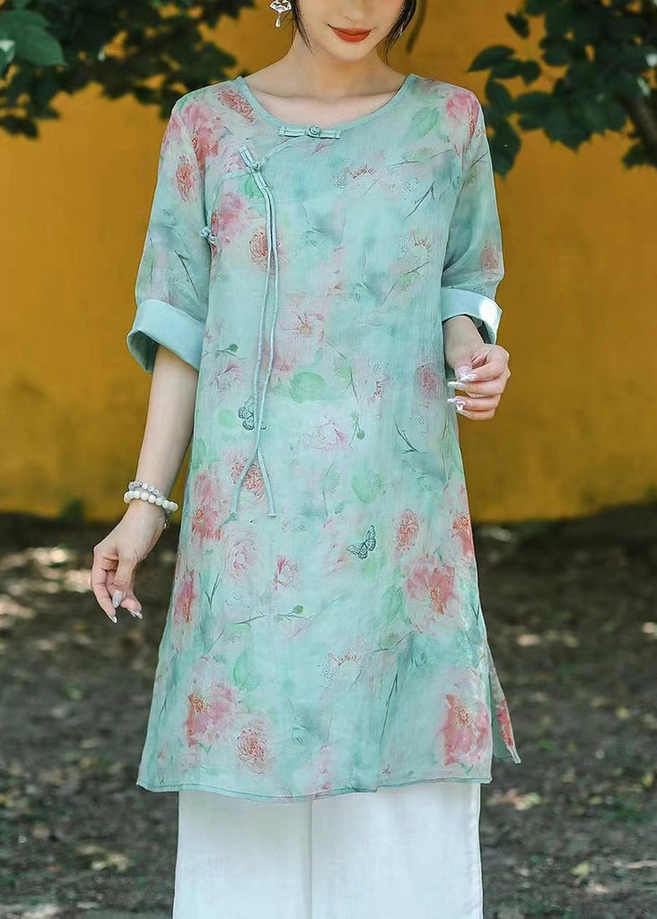 Art Light Green O Neck Button Print Linen Blouse Half Sleeve JH002