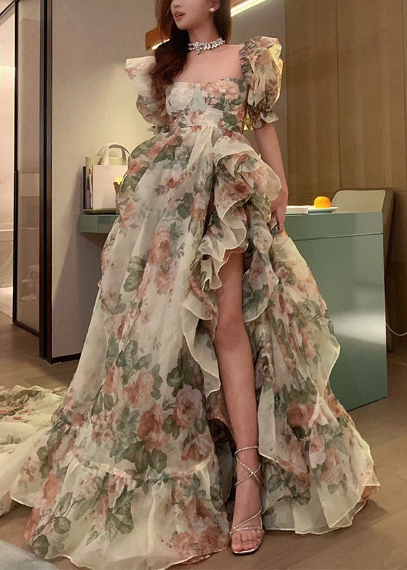 Beautiful Blue Print Ruffled Side Open Chiffon Maxi Dresses Summer XX041