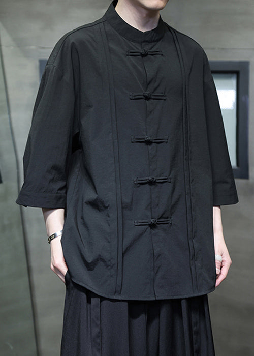 Black Solid Loose Silk Cotton Men Shirt Stand Collar Fall YT066