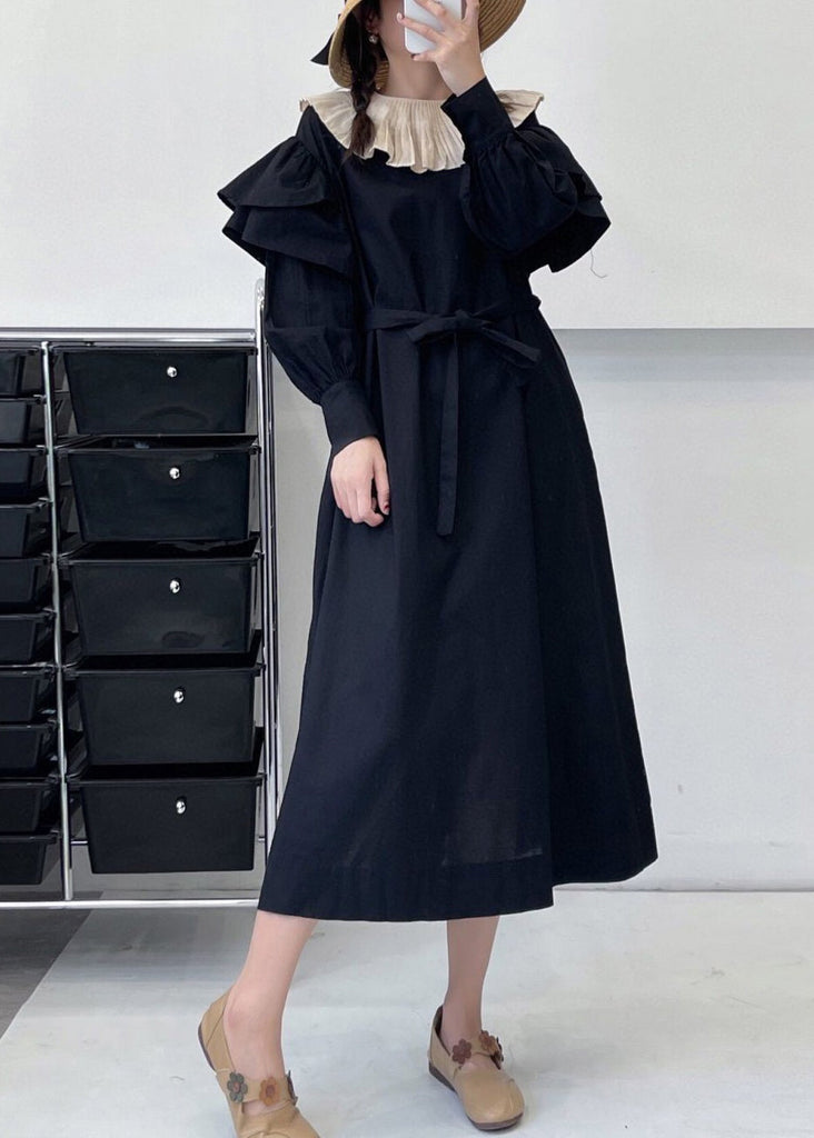 Black Solid Pockets Cotton Dress Ruffled Summer NN027