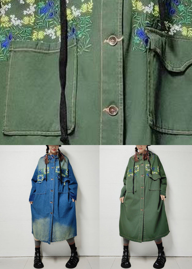 Blue Button Pockets Denim Trench Coat Embroidered Long Sleeve MN060