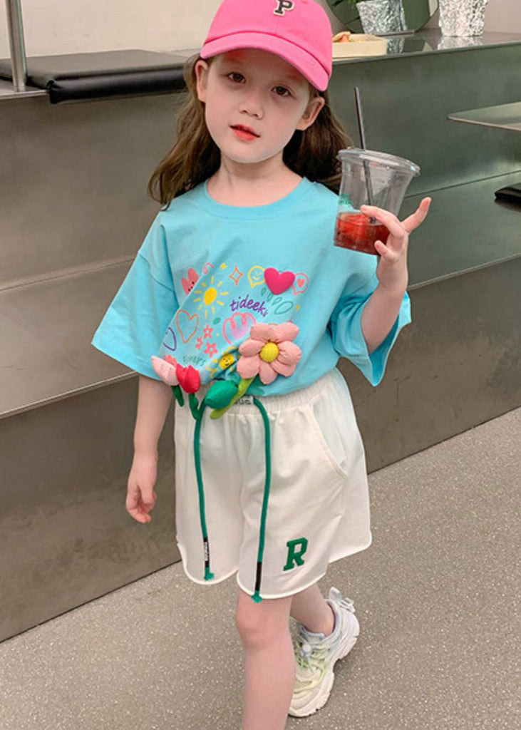 Blue Pockets Cotton Girls Two Pieces Set O Neck Short Sleeve YU1055