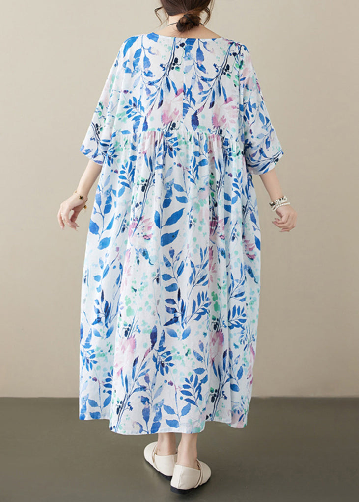 Casual Blue O Neck Print Plus Size Cotton Dress Summer AP047