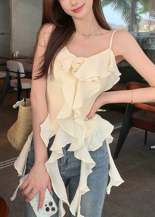 Chic Apricot Solid Ruffled Cotton Spaghetti Strap Tank Sleeveless EE1052
