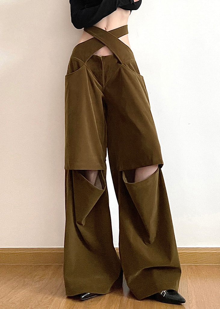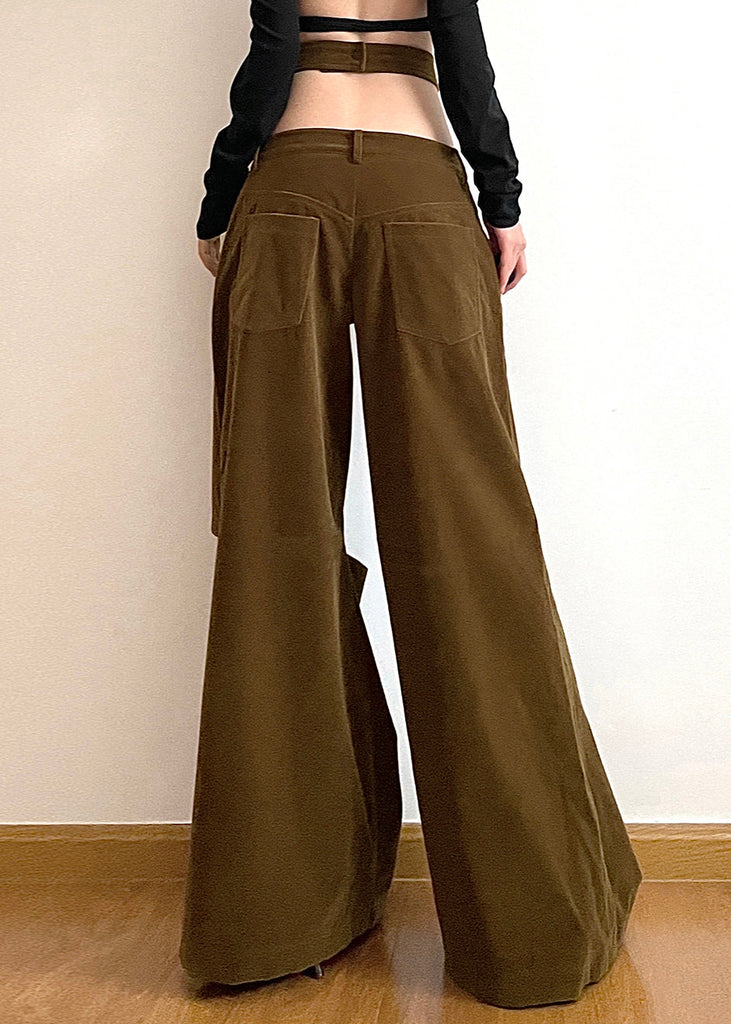 Chic Brown Hollow Out Pockets Cotton Wide Leg Pants Fall AW1008