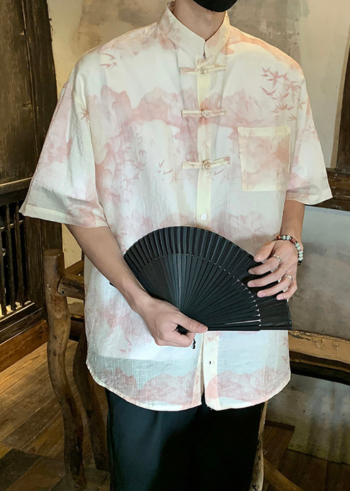 Chic Light Grey Chinese Button Print Ice Silk Mens Shirts Summer YT075