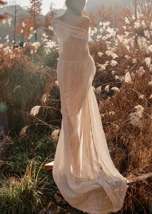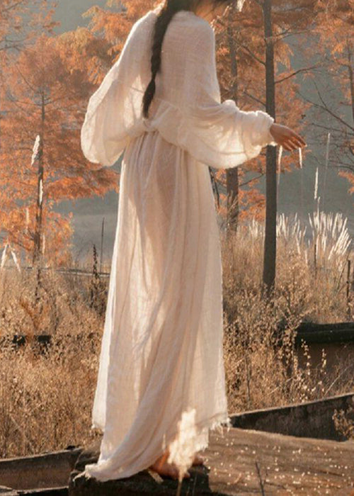 Classy White V Neck Tie Waist Cotton Dresses Long Sleeve KK062