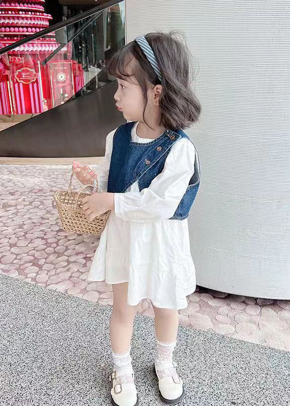 Cute Blue O-Neck Button Cotton Girls Two Pieces Set Long Sleeve XZ080