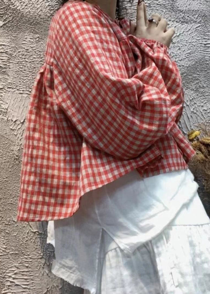 Cute Red Plaid O-Neck Button Cotton Shirt Top Long Sleeve BV015