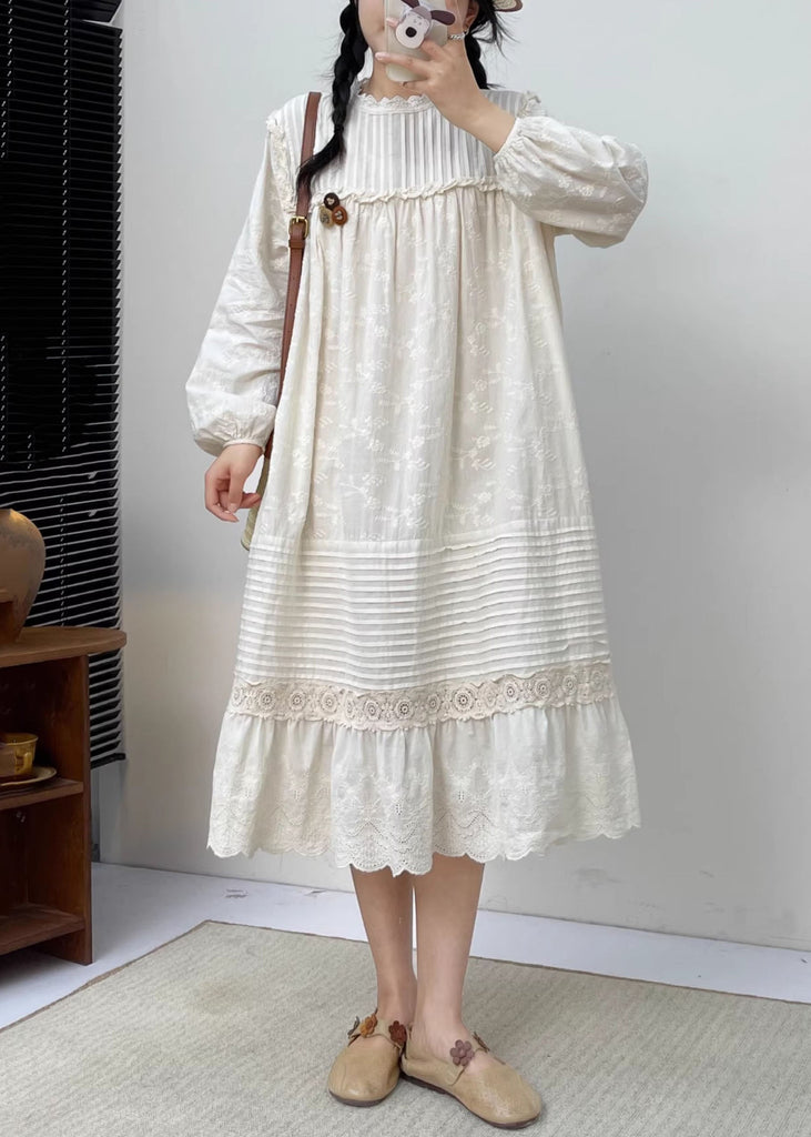 Cute White Embroidered Ruffled Patchwork Wrinkled Cotton Maxi Dress Long Slee BV030