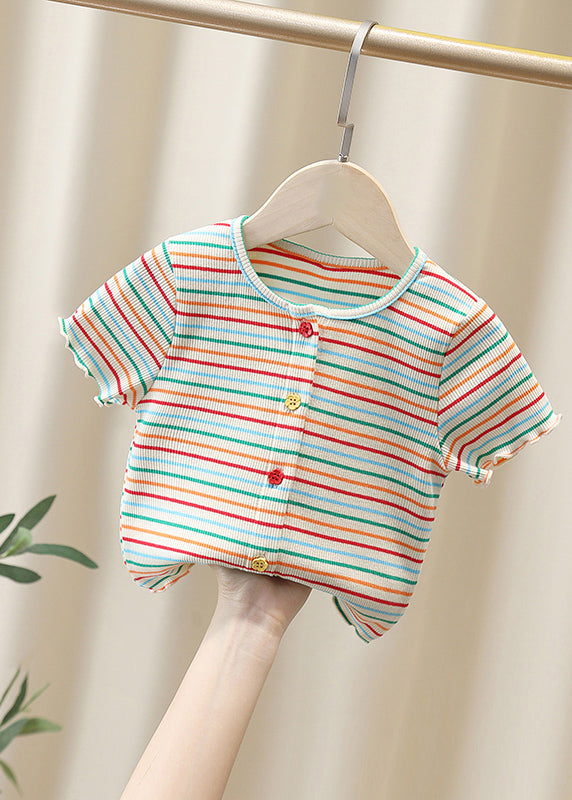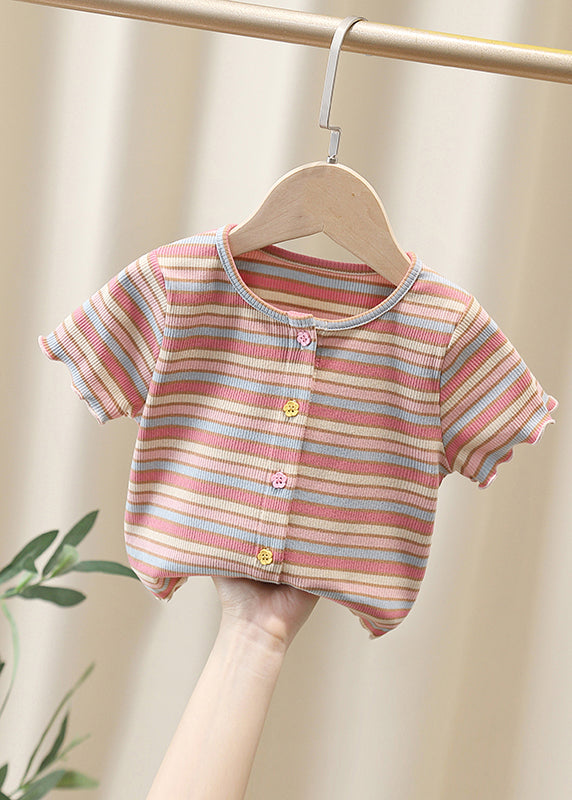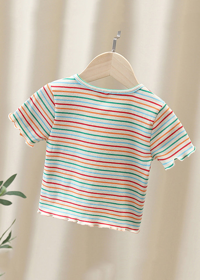 Cute White O-Neck Striped Knit Cotton Girls Top Summer YU1081